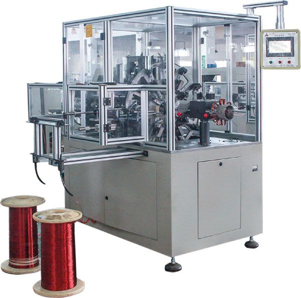 This machine is suitable for automatic winding of the three-phase stator wave windings of the automobile generator and automatic multi-times pushing coils to claw. Adopting international advanced double pulley double steel wire design, the steel wire has long service life. This machine is suitable and reliable for winding thick wire. It adopts PLC program control, color touch screen for setting parameters, servo motor for winding and arraying. It has functions of automatic multi-times pushing into tooling, automatic cutting, automatic turning, automatic winding and automatic pushing into the claws, and fault self-diagnosis display. It can complete of two three-phase stators coils at one time.