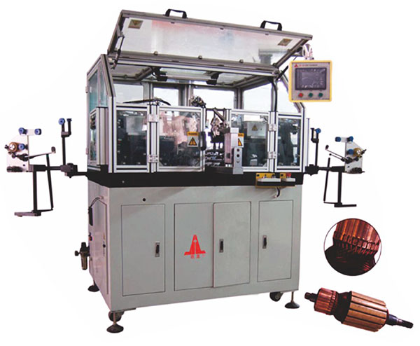 Applicable to electric tools, series motor, no hook groove commutator automatic winding. It adopts Mitsubishi three servo system, PLC program control, color touch screen control, single step, continuous working mode optional. Winding thread is automatically embedded in commutator slot, automatic clamping, automatic positioning, indexing, winding, hooking, automatic pulling The machine is equipped with scissors to cut the thread automatically. All the processes work continuously. It adopts detachable change tooling, adjustable tension force, uniform winding, manual loading and unloading, high production efficiency, and the machine has fault self-diagnosis function.